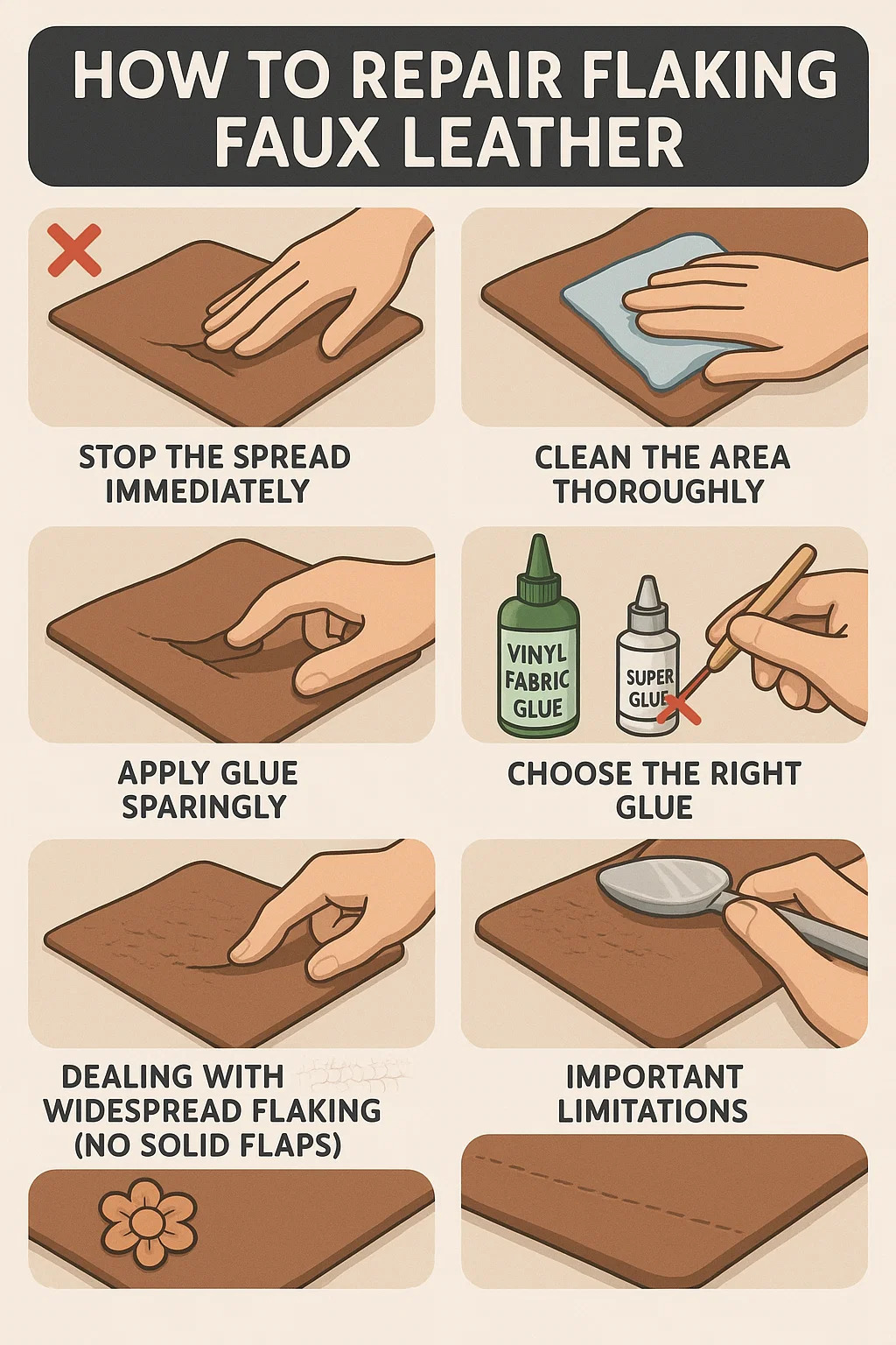 Iwasan ang Super Glue (cyanoacrylate): Nagdudulot ito ng matigas na bato at malutong. Kapag ang materyal na flexes, ang Super Glue ay mag -crack at mas masahol pa ang flaking. Maaari rin itong mantsang o matunaw ang ilang mga coatings.