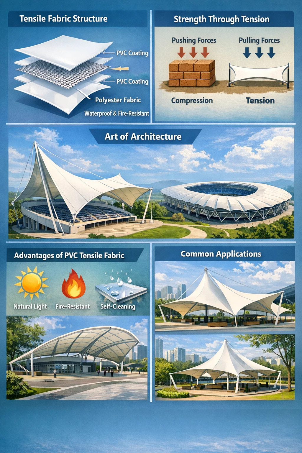 Ang makunat na tela ay isang espesyal na uri ng nababaluktot na tela na "may kakayahang magdala ng stress at timbang." Hindi tulad ng ordinaryong damit o mga kurtinang nakabitin nang maluwag, dapat itong "iunat nang mahigpit" gamit ang mga bakal na cable, suporta, o air pressure upang makabuo ng matibay ngunit magaan na hubog na ibabaw.