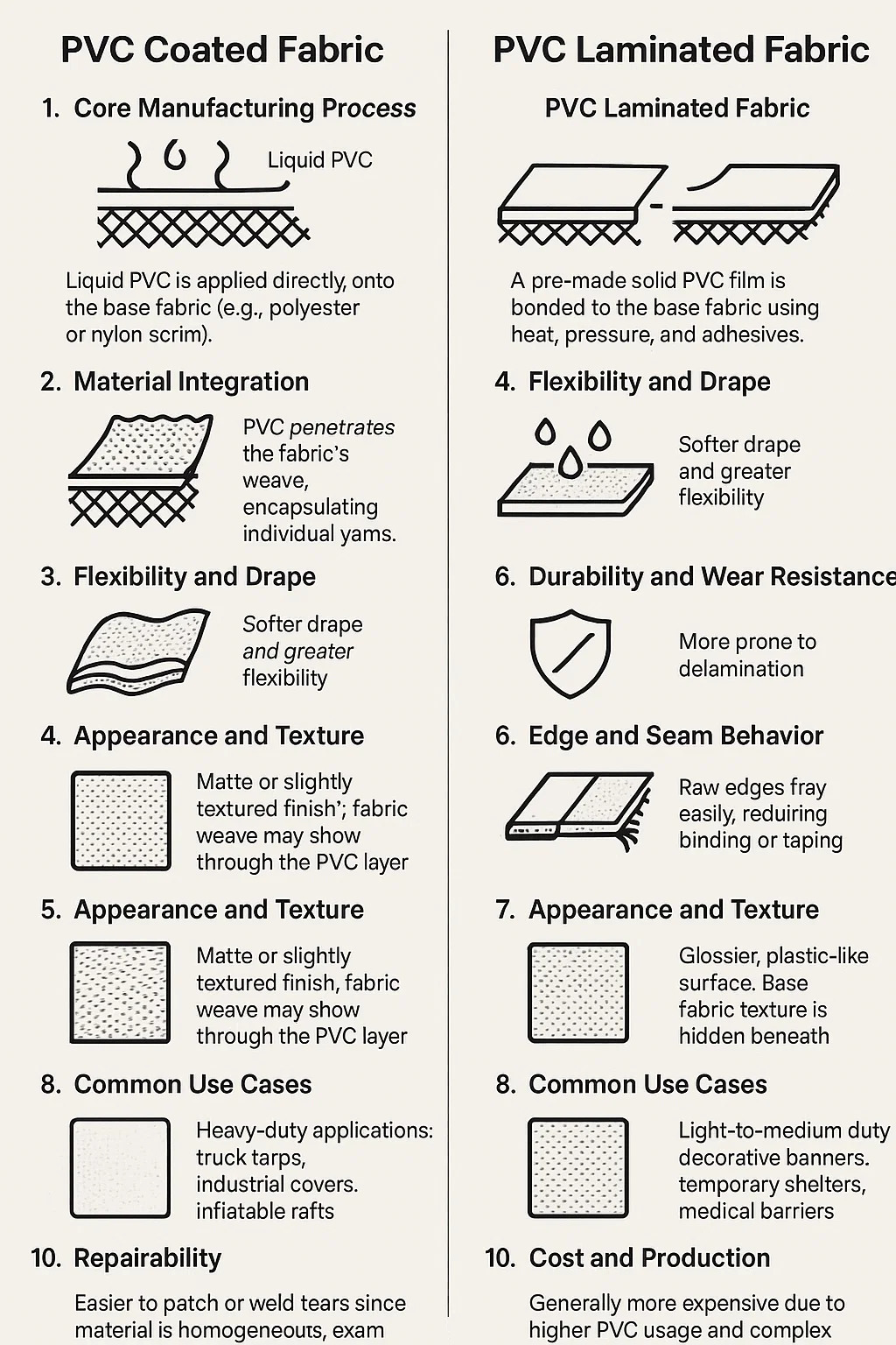 Laminated: Softer drape at higit na kakayahang umangkop. Ang tela ay gumagalaw nang mas malaya dahil ang PVC ay sumasaklaw lamang sa ibabaw.