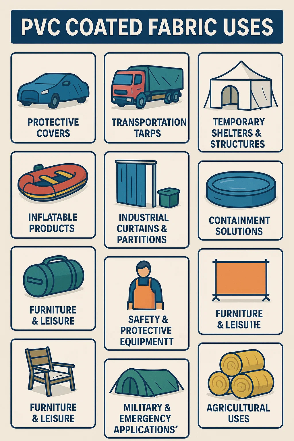 Narito ang isang pagkasira ng mga karaniwang gamit para sa PVC na pinahiran na tela , sumasalamin sa mga praktikal na aplikasyon nito: